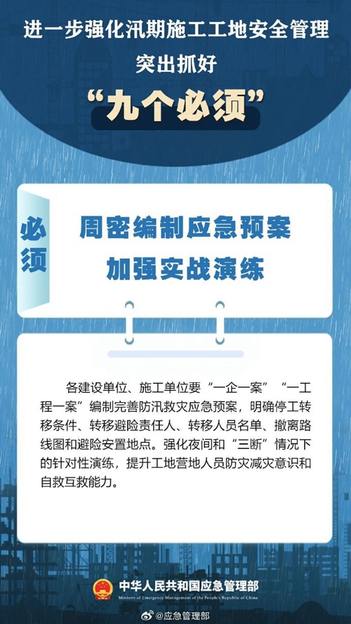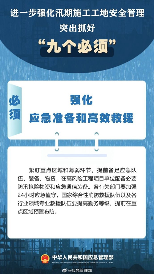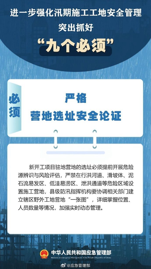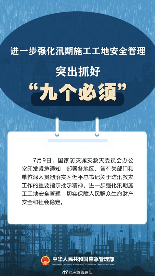 7月9日,國家防災(zāi)減災(zāi)救災(zāi)委員會(huì)辦公室印發(fā)緊急通知,進(jìn)一步強(qiáng)化汛期施工工地安全管理,要突出抓好“九個(gè)必須”↓↓ ???